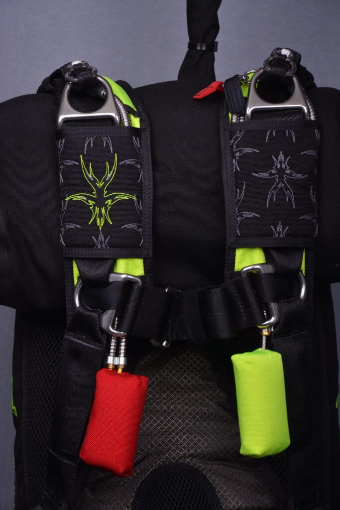 Mirage containers include a bungee retainer to help control leg strap movement during sit-flying and other aerobatic maneuvers.  All components are easily field replaceable.