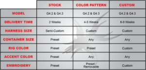 Use our Interactive Color Designer (or give us a serial # or a stock rig # to copy)